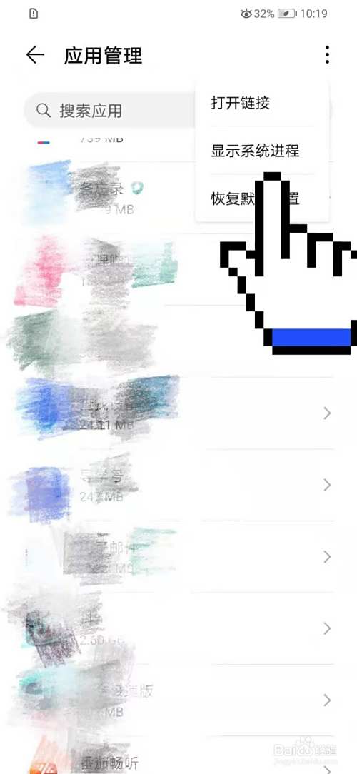 在应用管理页面找到右上角三个点,选择显示系统进程