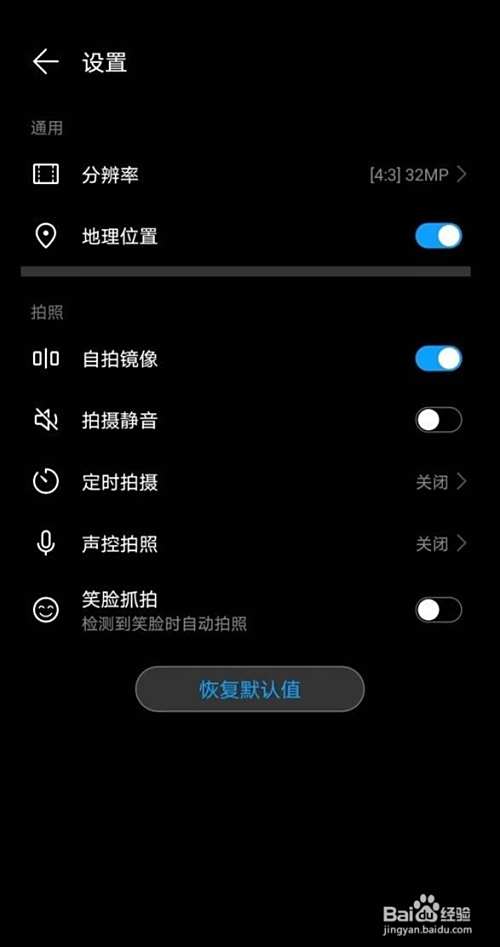 进入了相机设置界面后,可以设置相机分辨率、关闭相机快门声等。