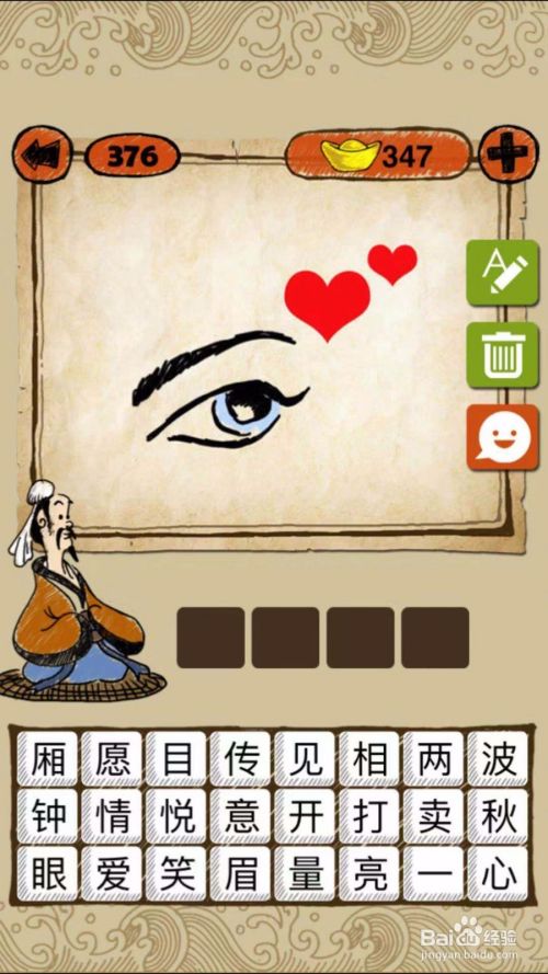 图片中有一只眼睛,在眼睛的前面有两个红心,表示他在用眼睛传递情宜,所以这个成语是眉目传情,