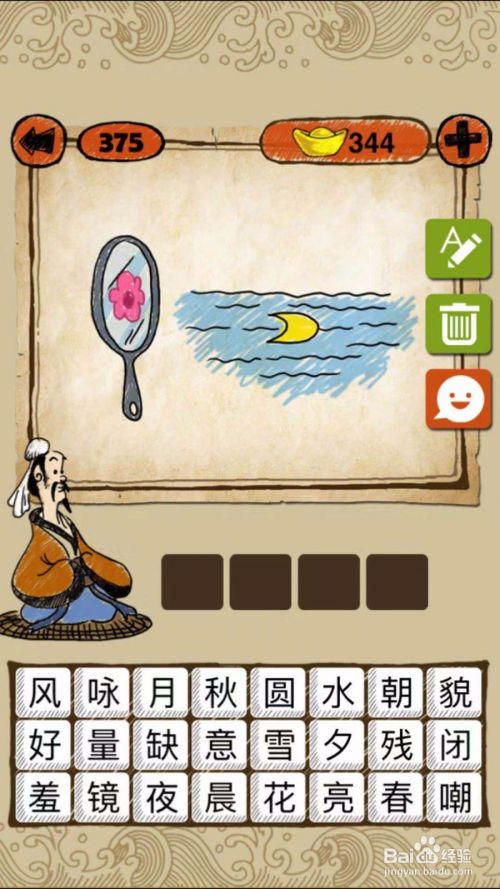 第375关,图片中有两处景象,分别表示诚意中的两个词组,一个是镜子里面有花,一个是水,里面有月,所以这个成语是镜花水月,