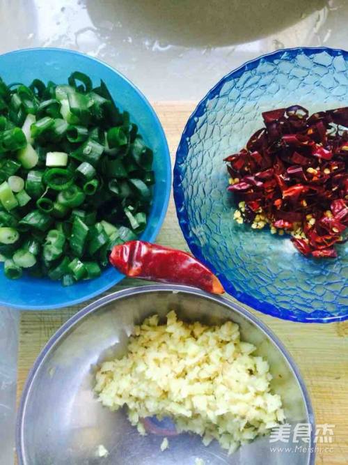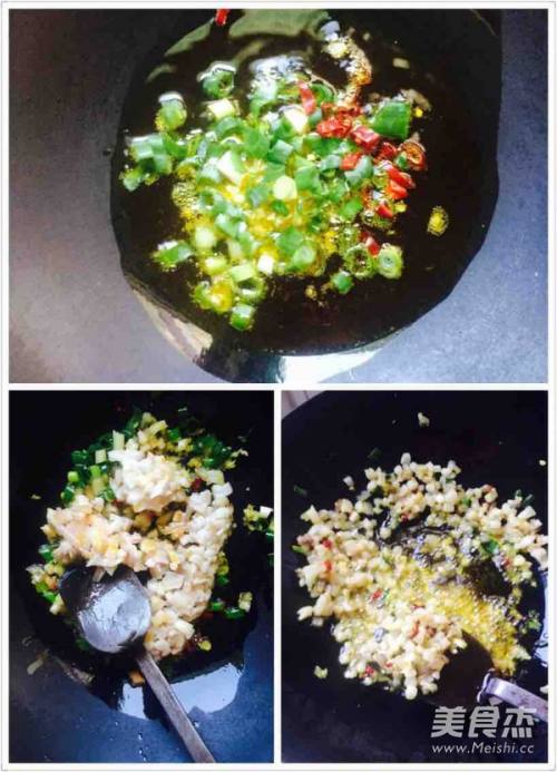 5烧热油,加入葱姜辣椒,煸炒。放入肥肉炒制。