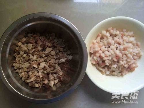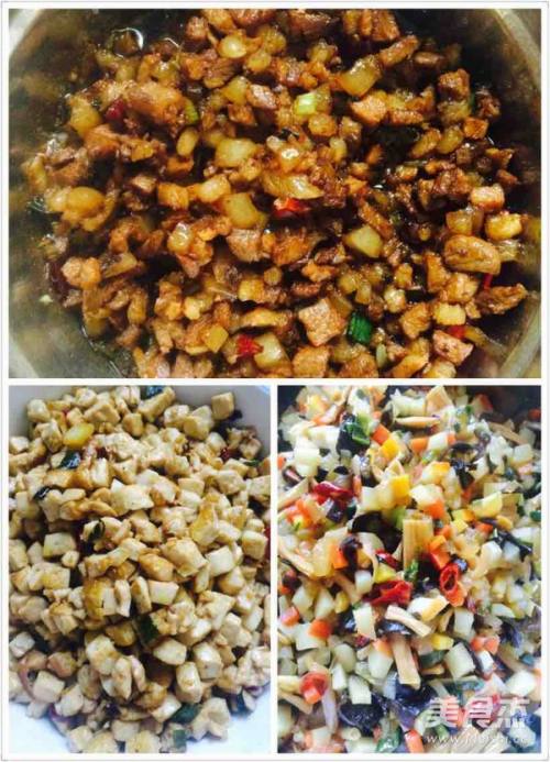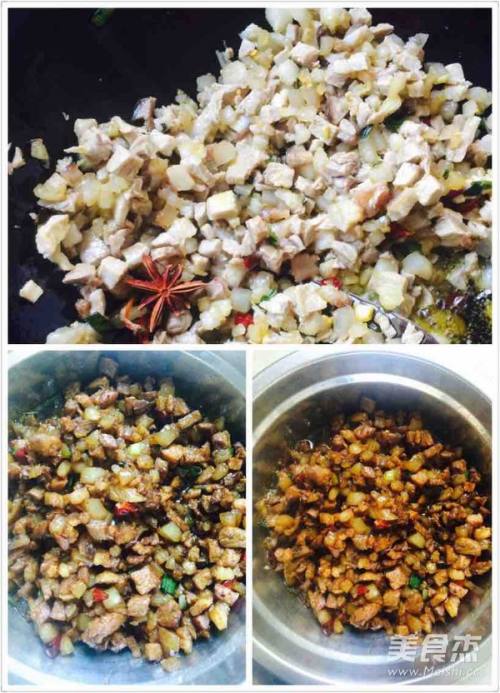 6当肥肉变色加入瘦肉,调料,盐,五香粉,味极鲜!翻炒至熟后放入盐即可。