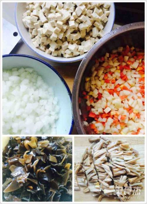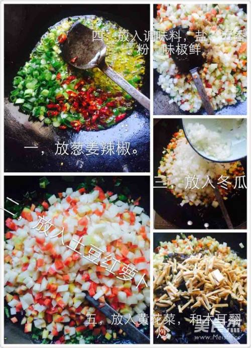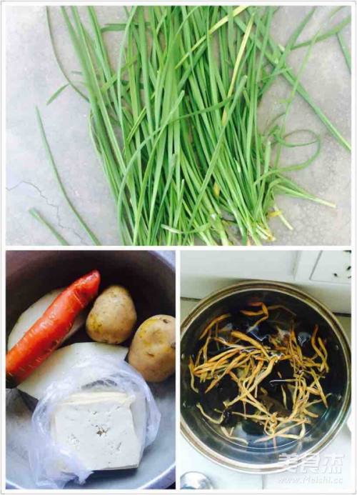 1土豆,红萝卜,冬瓜,洗净去皮。干黄花菜,木耳泡发。韭菜摘干净!