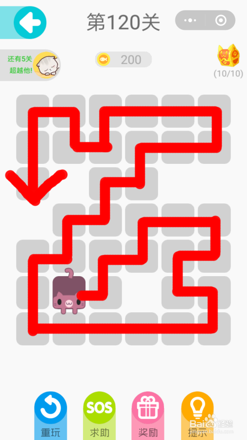 第120关:第120关的总体过关攻略是先将右下方的先画完,然后在画左下方,从左下方上去之后就比较简单,沿着红线的箭头方向画出,第129关就顺利过关了。