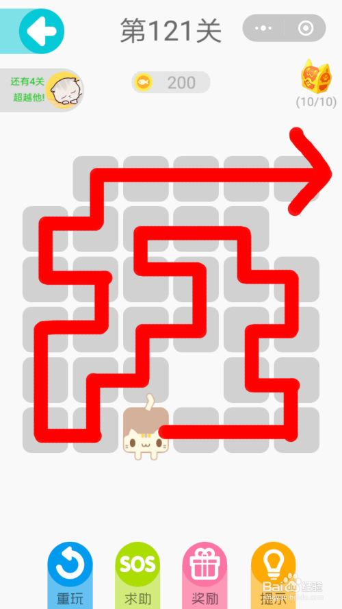 第122关:从出发点开始,沿着下图红线的方向,先话下方第一行,从下方第一行画上去,将上方右侧的先画完,再从右侧曲折画到左侧,从左侧上方画出。第122关就可以过关了。