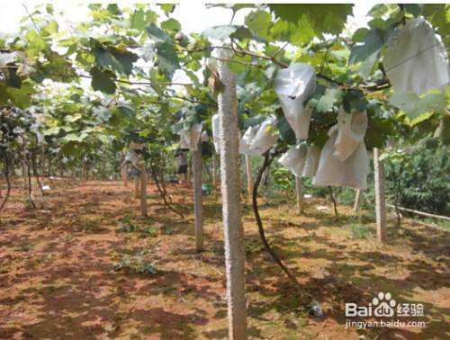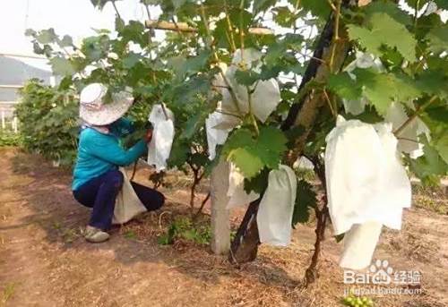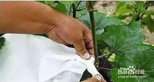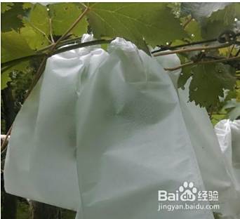 套袋方法:在喷完药且药液干后套袋,套袋时先用手将纸袋撑开,使纸袋整个鼓起,然后由下往上将整个果穗全部套入袋内,再将袋口收缩到穗柄上,用一侧的封口丝紧紧扎住。时间是晴天上午9时-11时或下午2时-6时为宜,人手多的话尽量一天套完。选定幼果(穗)后,左手托住纸袋,右手撑开袋口,令袋体膨起,使袋底两角的通气放水孔张开,手执袋口套入果实(穗),果柄置于袋的开口基部(勿将叶片和枝条装入袋子内),然后从袋口两侧按“折扇”方式折叠袋口于切口处,将捆扎丝沿旋转1周扎紧袋口,使幼果(穗)在袋内悬空,不要将捆扎丝缠在果柄上,套袋应连同果枝一起捆扎。套袋时用力方向要向过柄基部,用力宜轻,尽量不碰触幼果(穗)。套袋的顺序为先上后下,先里后外。果实袋涂有农药,套袋结束后应洗衣手,以防中毒。