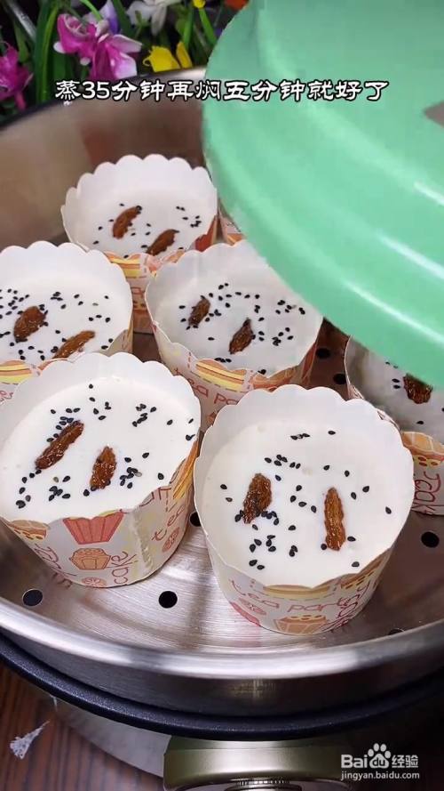 最后,将面糊倒纸杯中,再撒上点葡萄干,白芝麻,盖上锅盖蒸35分钟后,再闷五分钟即可