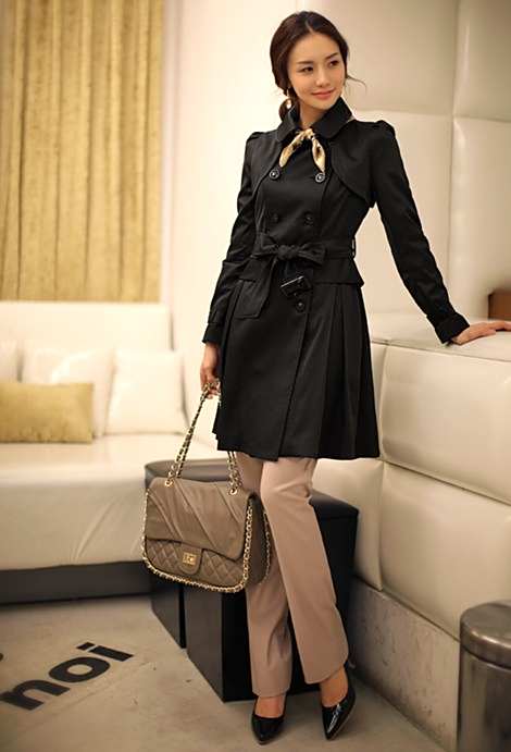超显身材的黑色长款风衣穿起来整个人都变得苗条,用米色的休闲裤搭配增加几分淑女气息。如果觉得上身过于单调,不妨尝试用淡黄的印花丝巾装点一下,拿上一个金属链条的手袋就可以随意应付各种场合了。