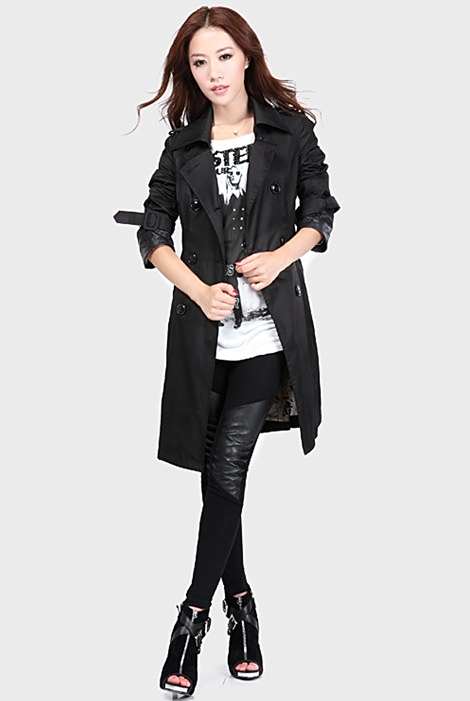 非常个性的风衣,简单的款式有极佳的修身效果,为你带来超吸引的OL气质装扮,用白色的T恤搭配黑色的长款风衣视觉感最好,黑色的紧身裤形成的修身线条与上身的版型呼应,超赞~~皮革花纹面料拼接,时尚潮流都不失。