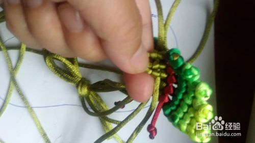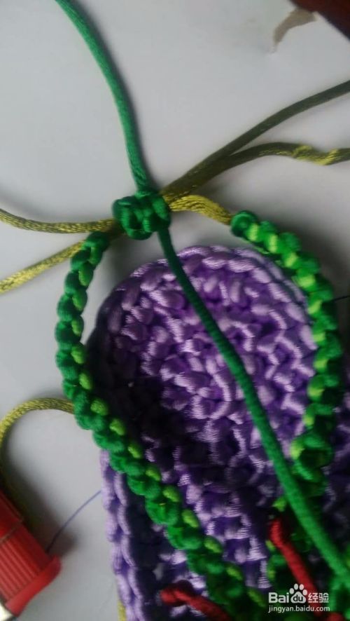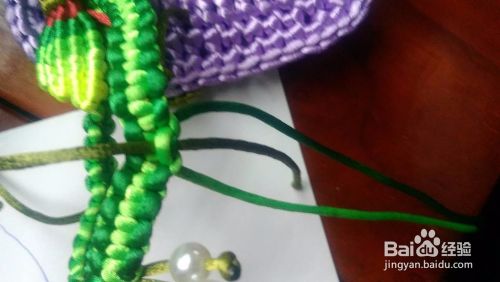 像图中那样用打火机将深绿和浅绿链接起来 把剩下的那四根线做为轴线 编平结。编到合适的位置。