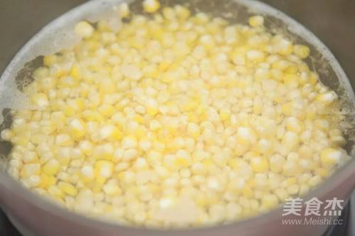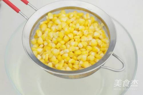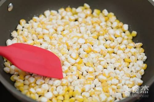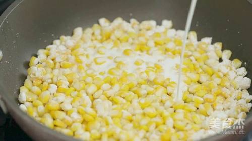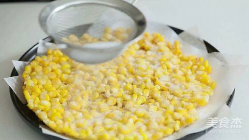 7水淀粉倒入玉米粒上,煎至无水状态,再倒入没过食材的食用油炸3-5分钟,炸至玉米粒金黄酥脆就可以出锅了