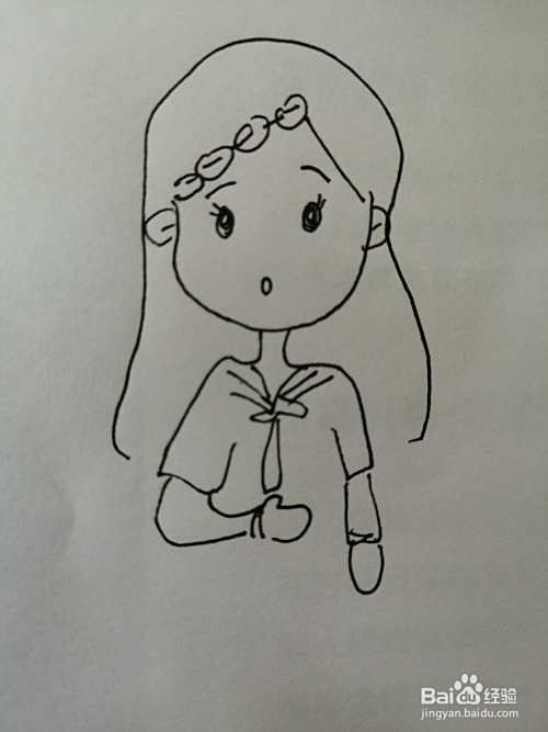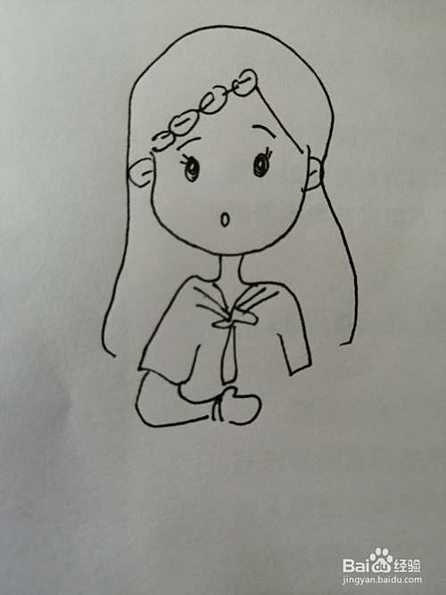 第五步,接着继续画出可爱的小女孩的衣服,注意衣服上领结的画法。