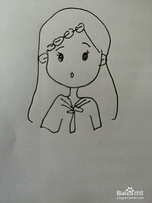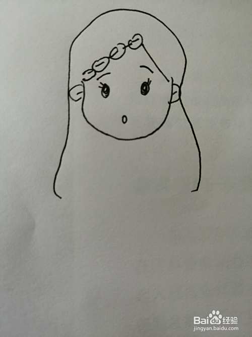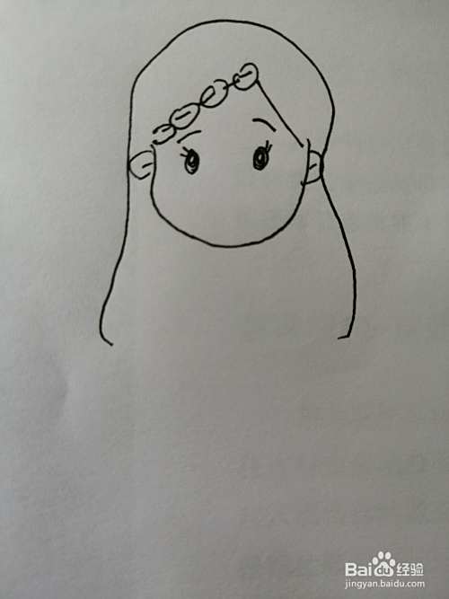 第四步,接着在小女孩的弯弯眉毛下面画出漂亮的眼睛和小嘴巴,画法比较简单。