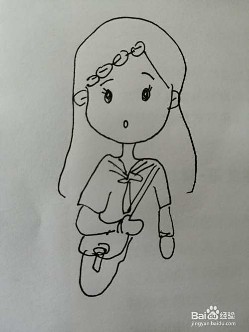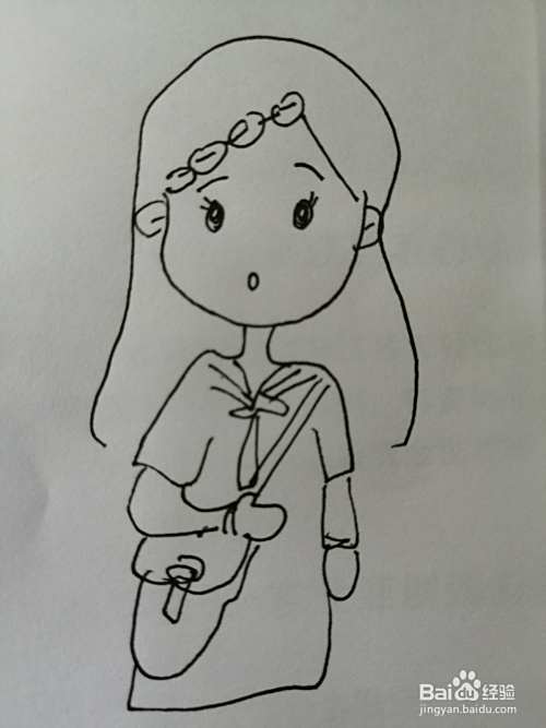 第七步,最后把可爱的小女孩的小裙子和侧面的挎包画出来。可爱的小女孩就画好了。