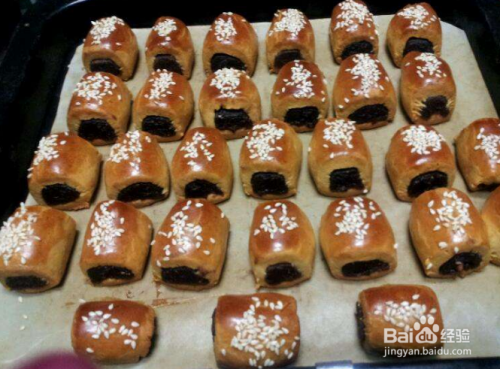另一半面皮折叠过来,盖在豆沙馅上,将边缘捏住。放到烤盘里,表面刷蛋液。