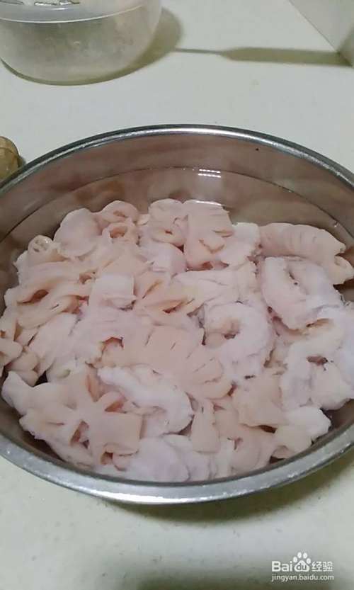 准备材料,猪生肠用水加入一勺广东米酒浸泡15分钟再冲洗干净