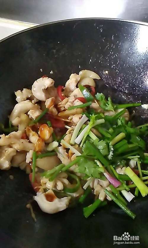 最后加入葱段和香菜、蚝油翻炒均匀即可