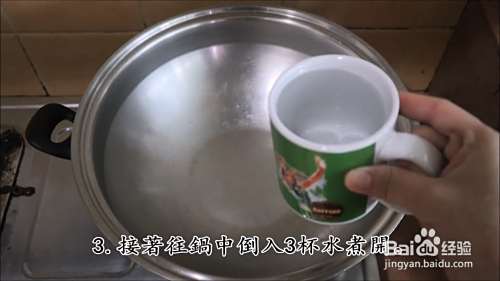 然后在锅中加入三杯清水烧开