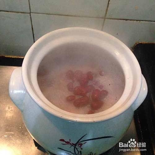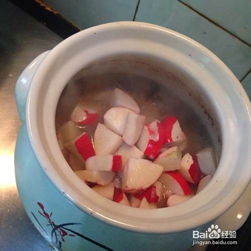 汤炖了一个小时后,闻着飘香的汤味,把萝卜和姜片倒进炖罐。二十分钟左右,把红枣倒进炖罐。