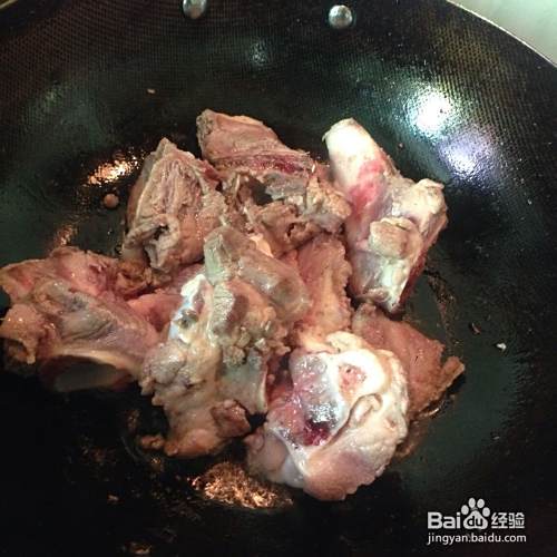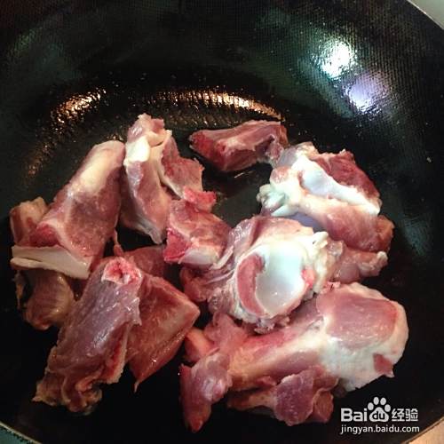 锅烧热,给适量的食用油,加点盐,把筒子骨倒进锅里面爆炒,炒至金黄色
