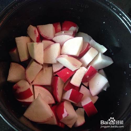 筒子骨买回来用盐水浸泡半小时,然后冲洗干净。萝卜洗干净,切成块备用