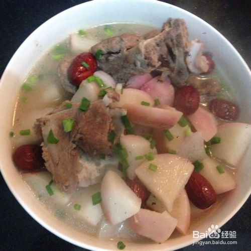 文火慢炖20分钟后,筒子骨,萝卜和红枣都熟了,盛盘,撒点葱花。