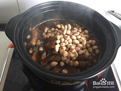 锅中加入适量的清水,然后把焯水过的猪蹄放入锅中,生姜洗干净之后切片放入锅中,然后把泡好的花生也放入锅中。