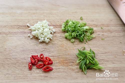 小米椒、葱叶斜着切成小圈,大蒜和葱白切碎备用。