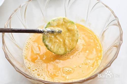 将西葫芦片放到面粉中,两面裹上薄薄的一层面粉。