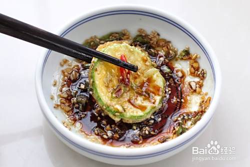 葱、蒜末中加入生抽、0.5克盐、糖、熟芝麻和芝麻油搅拌均匀,煎好的西葫芦蘸酱汁食用口感更佳。