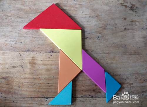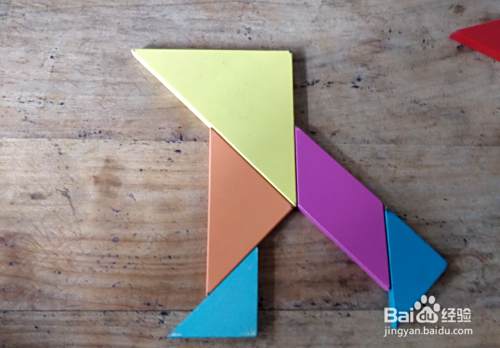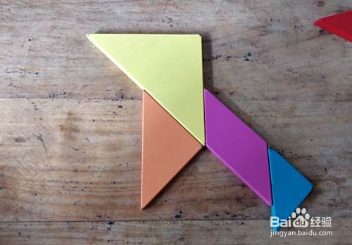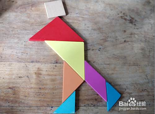 摆上正方形,放在红色三角形的上面挨着,如图。这样就拼组好了。