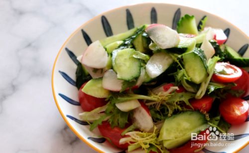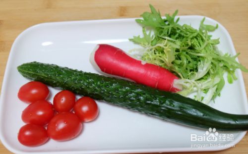 黄瓜1根、水萝卜1根、小番茄6粒、苦苣一棵、 油醋汁适量