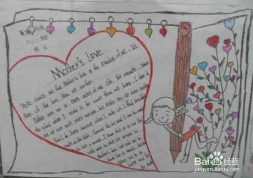 手抄报的右侧画上一个小朋友和许多的花朵,左侧画一个心形,并用英语写上妈妈的爱,内容主要写妈妈是怎么爱我的。