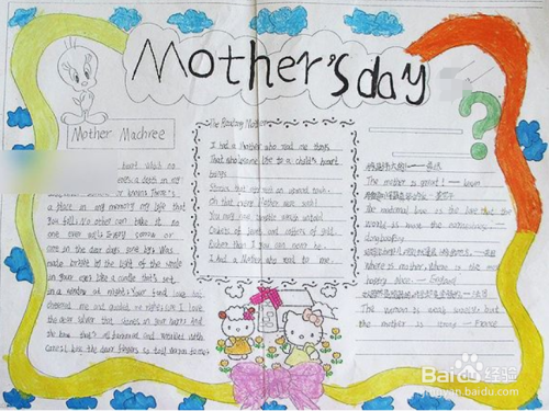 手抄报的四周用红色和黄色作为花边,大题目写在最上方,写上母亲节,下净捕棍方画上小猫和房子,左侧写母亲节的来历,中间写我的妈妈,右侧写关于母亲节的名言。