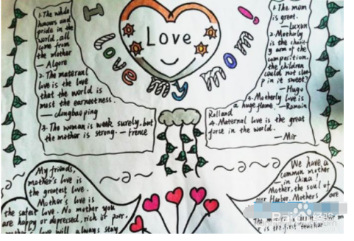 手抄报的正中间画一个心,写上我爱妈妈,两侧写上我爱妈妈的句子,左下角写妈妈的爱的英语句子。