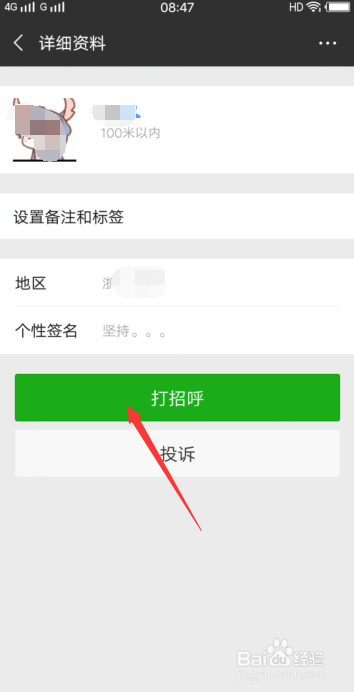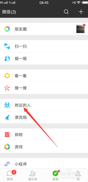 打开微信后,点击底部的发现按钮,进入到发现界面后,选择附近的人,查看后,找到想添加的用户,点击打招呼即可。