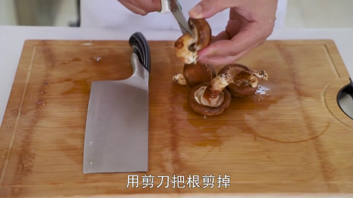 将洗净的香菇用剪刀把根剪掉,切薄片。