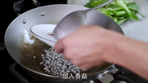 热锅放油,加入姜米爆香,加入香菇,翻炒两下。
