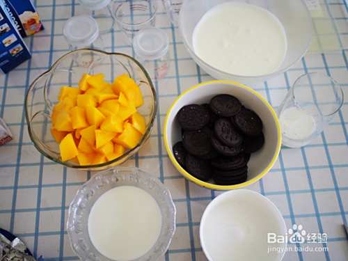 提前准备好所有材料,吉利丁片用冰水泡软,这次主要用的是戚风蛋糕做底胚 图中是之前用奥利奥做底胚的,用消化饼或者奥利奥做法更简单:消化饼干或者奥利奥80g用保鲜袋装起来,用擀面杖碾碎,加入融化液态的黄油搅拌均匀,倒入模具底部压平压实,冰箱冷藏即可。