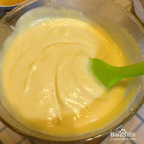 将打发的淡奶油倒入芒果泥糊中,搅拌均匀 这样慕斯糊就做好了
