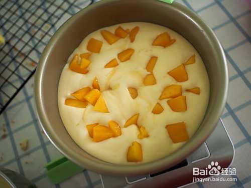 把一片戚风蛋糕垫在模具底部,倒入慕斯糊(中间可加一些芒果丁 )