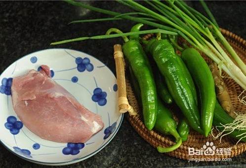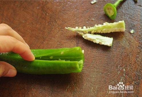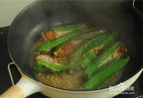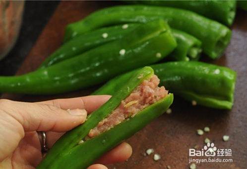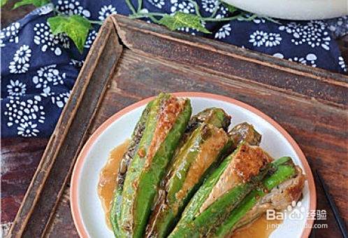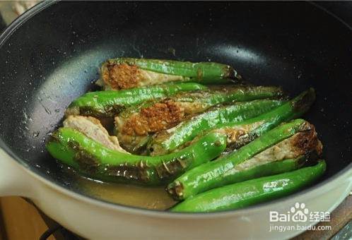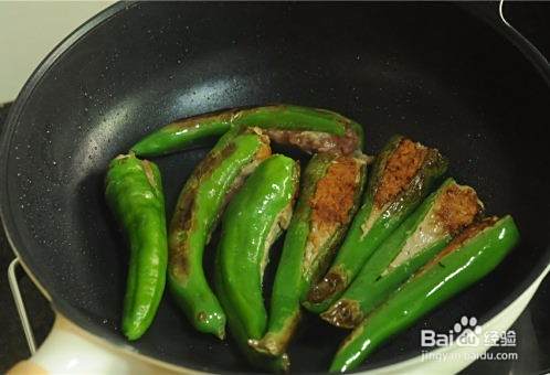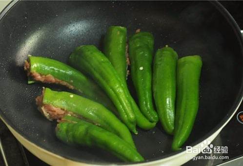 锅烧热,倒入少许油,烧热后将青椒摆在平底锅里煎,将有肉的一面朝下,小火慢煎