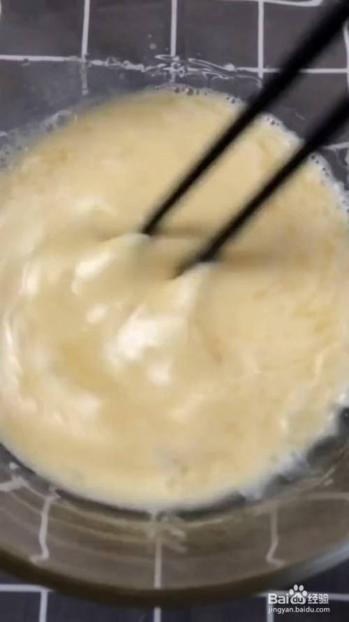首先,我们在碗中打入两个鸡蛋,加入30克白糖、10克食用油和100克纯牛奶搅拌均匀。
