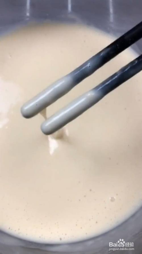 然后,加入90克面粉、2克泡打粉将它们过筛到碗中,调成浓稠的面糊。
