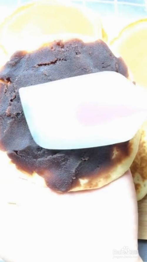 最后,平底锅不用刷油,倒入面糊,摊成小饼,小火煎至表面蜂窝状,翻到另一面,中间抹上豆沙,再盖上一层,铜锣烧就做好啦!