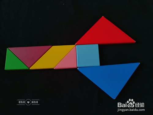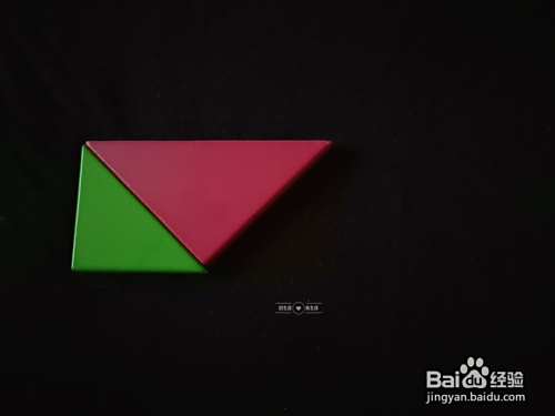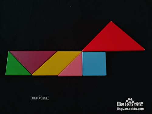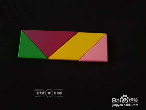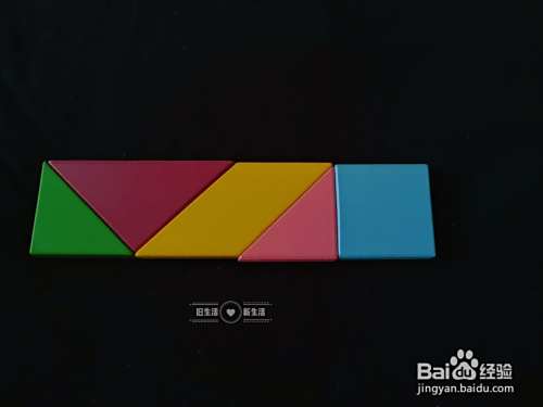 拿出一个天蓝色正方形放在粉色小三角形的旁边,如下图所示。