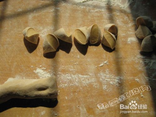 面团醒好以后取出来放案板上揉圆,从面团中间掏个洞,然后搓成长条,切成小剂子。(切剂子时要注意切一下转动一下面条)
