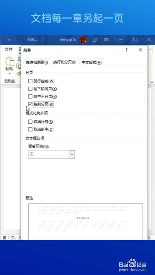 在页面中按下alt+O+P,弹出段落对话框,切换至换行和分页,勾选段前分页,点击确定即可完成。