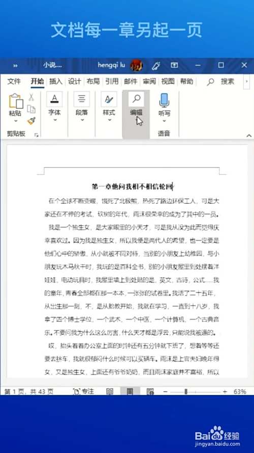 打开word文档,鼠标点击在章节的标题上,然后再点击开始选项卡下的编辑。