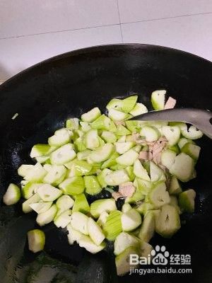 油热下肉炒变色,加葱爆锅,丝瓜入锅翻炒